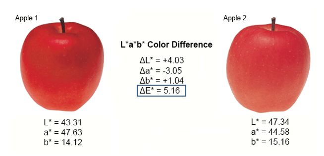 İlk bakışta ikisinin de kırmızı olduğunu söyleyeceğimiz elmaların rengi yukarıda bahsettiğim üç değişken kullanılarak koordinat düzleminde tespit edilebilir. Elmaların renklerini temsil eden bu iki nokta arasındaki fark ΔE (delta E) adı verilen renk farkı değeridir. Tespit edilen ΔE’nin 1 değerinden küçük olması iki renk arasında gözle görülebilir bir fark olmadığı anlamına gelir. 1 ve 3 arasındaki değerler sanatsal ve teknik çalışmalar dışında yine önemli bir farklılık anlamına gelmediğini ifade ederken 3 ve üstü değerler belirgin ve önemli bir fark olduğunu söyler. Bu sebeple ΔE değeri 5.16 olan bu örnekte eğer soldaki elma kırmızı olarak nitelendirilirse sağdaki elma teknik olarak kırmızı değildir; bu yalnızca bizim gördüğümüz rengi genel olarak ifade etme şeklimizdir.